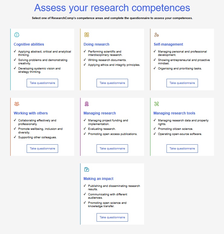 Récemment, la Commission européenne a mis en place un outil d’auto-évaluation des compétences du ResearchComp (ResearchComp Self-Assessment Tool) Cet outil d’auto-évaluation, disponible en ligne, se présente sous la forme d’un questionnaire à choix multiples, structuré selon les sept domaines de compétence de ResearchComp. Une fois chaque domaine complété, les résultats vous fourniront des informations sur vos points forts et les domaines à améliorer.