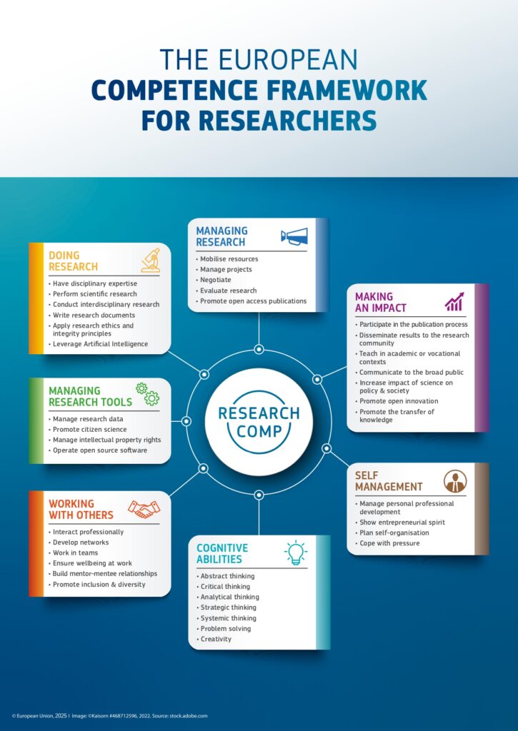 ResearchComp (The European Competence Framework for Researchers) est un outil développé par la commission Européenne qui aide les chercheurs à évaluer et à développer leurs compétences dans des domaines clés. L’objectif est d’encourager les chercheurs à se doter des compétences transversales nécessaires pour mener une carrière efficace et fructueuse dans tous les secteurs pertinents de la société, y compris le monde universitaire, l’industrie, l’administration publique et le secteur à but non lucratif. ResearchComp est donc un outil qui vise à favoriser le développement de la carrière des chercheurs.