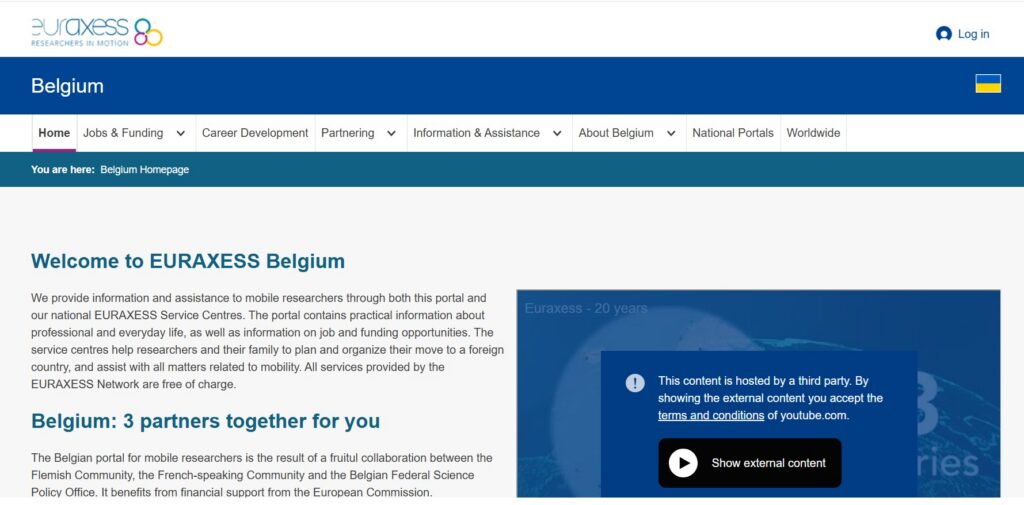Interface du portail Euraxess belge